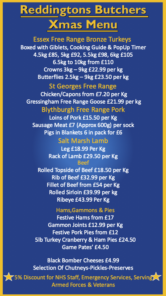 Reddingtons Butchers are purveyors of fine meat. All our Pork and Sausages are made from Free Range Blythburgh Pork,Our Lamb is SaltMarsh Lamb from West Mersea and our Beef is locally sourced in Essex.