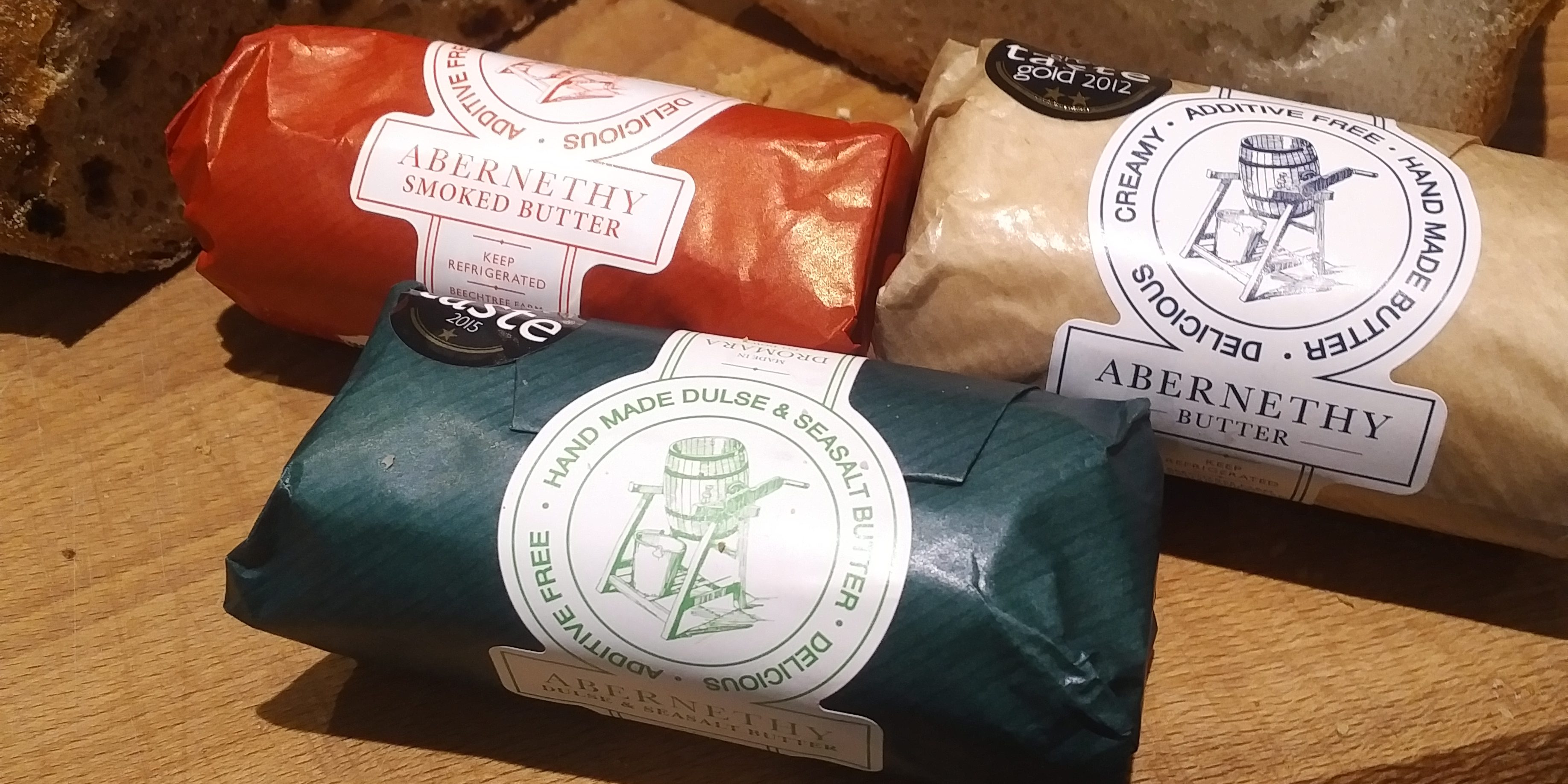 Abernethy Butter is made by hand using traditional methods.The cream is bought from a local farmer, who lets his cows graze on the green fields in the Lagan valley and pasturises his own milk.The cream is churned until it separates into butter and buttermilk.Then the butter is put into a large bowl and washed by hand until the water runs clear. This is to remove all the buttermilk which would sour the butter.The only thing we add to our butter is a pinch or two of salt.